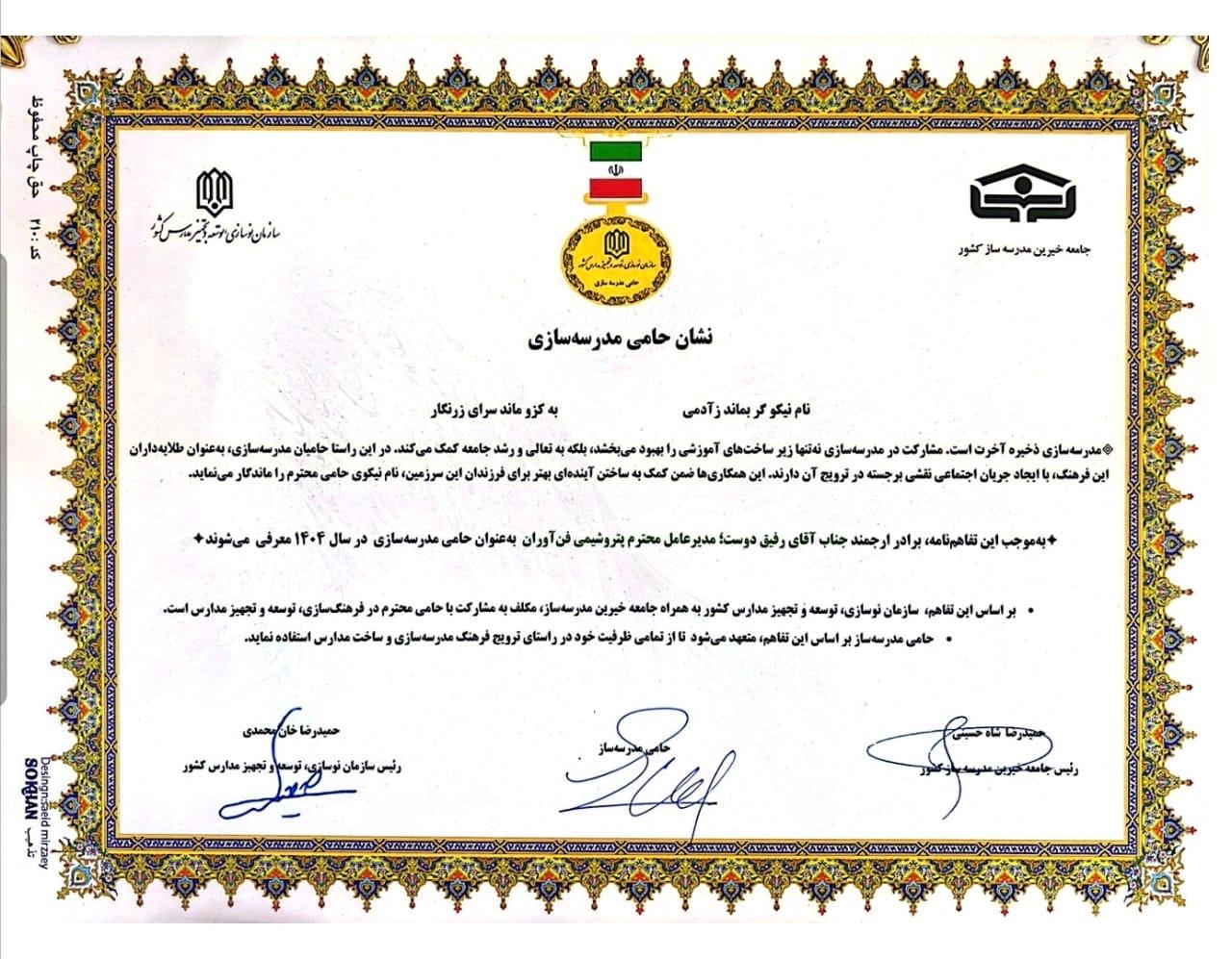در راستای تحقق عدالت آموزشی و توسعه زیرساخت مدال افتخار «حامی مدرسهسازی ایران» به شرکت پتروشیمی فنآوران اهدا شد