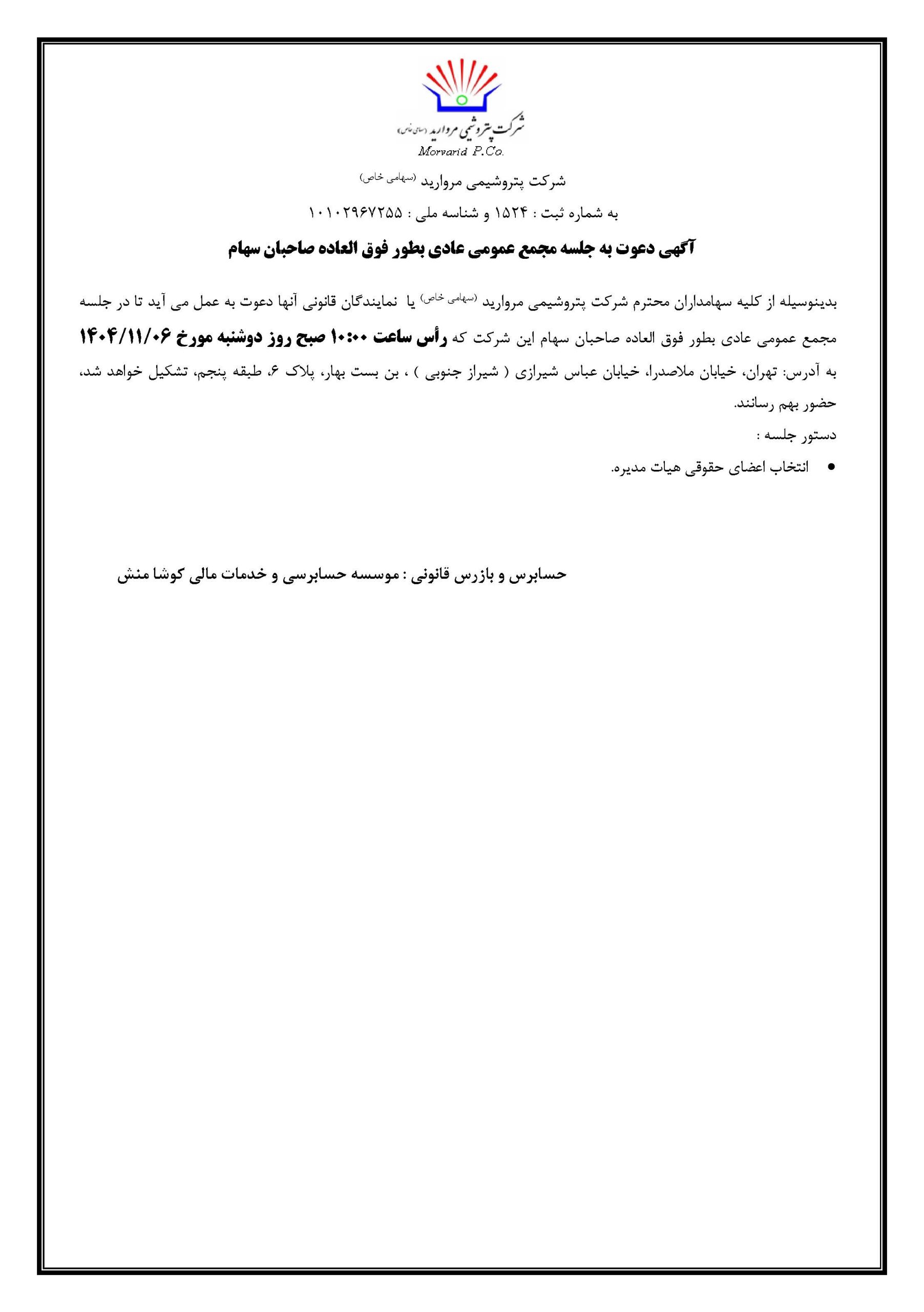 بدینوسیله از کلیه سهامداران محترم شرکت پتروشیمی مروارید (سهامی خاص) یا نمایندگان قانونی آنها دعوت به عمل میآید تا در جلسه مجمع عمومی عادی بطور فوق العاده صاحبان سهام این شرکت که رأس ساعت ۱۰:۰۰ صبح روز دوشنبه مورخ ۱۴۰۴/۱۱/۰۶ به آدرس: تهران، خیابان ملاصدرا، خیابان عباس شیرازی (شیراز جنوبی)، بن بست بهار، پلاک ۶، طبقه پنجم، تشکیل خواهد شد، حضور بهم رسانند.