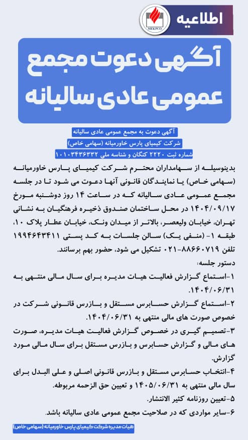 آگهی دعوت به مجمع عمومی عادی سالیانه شرکت پتروشیمی کیمیای پارس خاورمیانه
