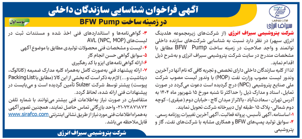 شرکت پتروشیمی سیراف انرژی (از شرکتهای زیرمجموعه هلدینگ انرژی سپهر) در نظر دارد نسبت به شناسایی شرکتهای سازنده داخلی توانمند و واجد صلاحیت در زمینه ساخت BFW Pump مطابق با مشخصات مندرج در سایت شرکت پتروشیمی سیراف انرژی و به شرح ذیل اقدام نماید.