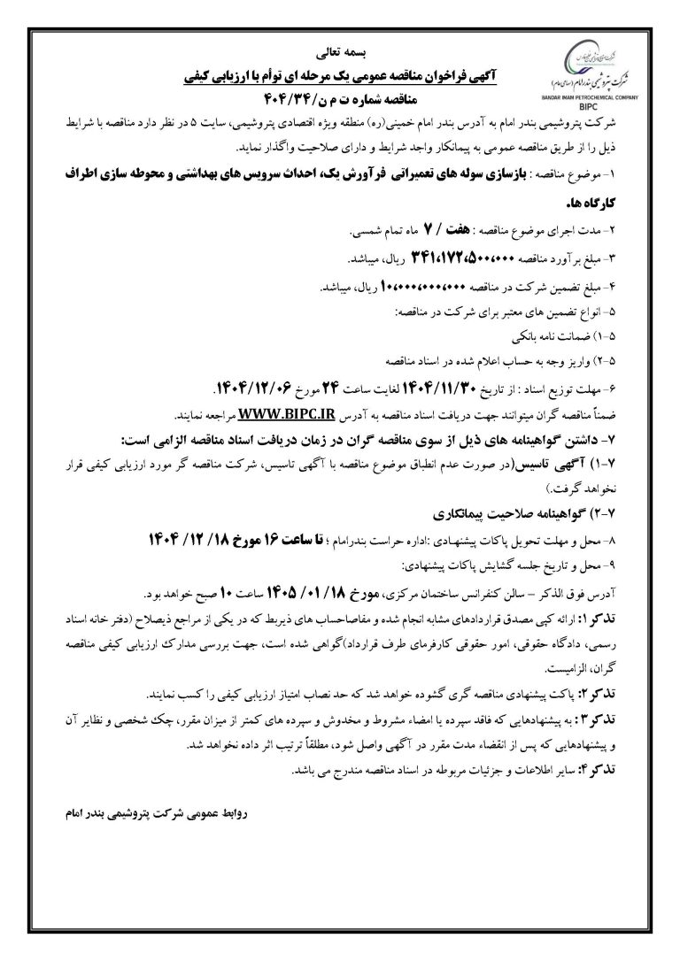 آگهی فراخوان مناقصه عمومی یک مرحله‌ای توأم با ارزیابی کیفی پتروشیمی بندر امام