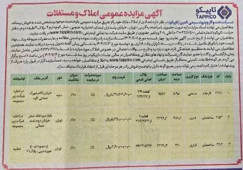 شرکت نفت و گاز و پتروشیمی تأمین (تاپیکو) در نظر دارد تعدادی از املاک مازاد خود را از طریق مزایده عمومی با وضعیت موجود و مشخص شده به فروش برساند.
