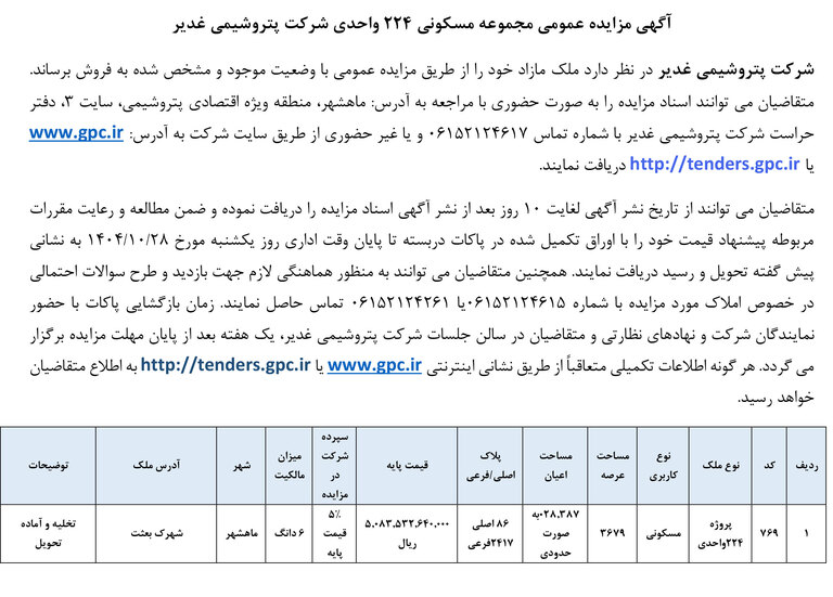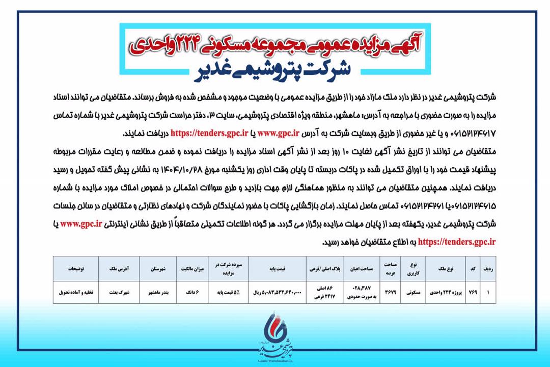 آگهی مزایده عمومی مجموع مسکونی ۲۲۴ واحدی شرکت پتروشیمی غدیر