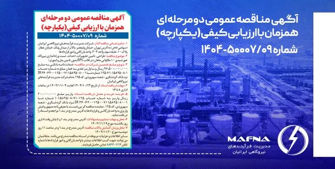 آگهی مناقصه عمومی دو مرحلهای همزمان با ارزیابی کیفی (یکپارچه) شماره ۰۹/۵۰۰۰۷-۱۴۰۴ شرکت نیروگاه ایرانیان