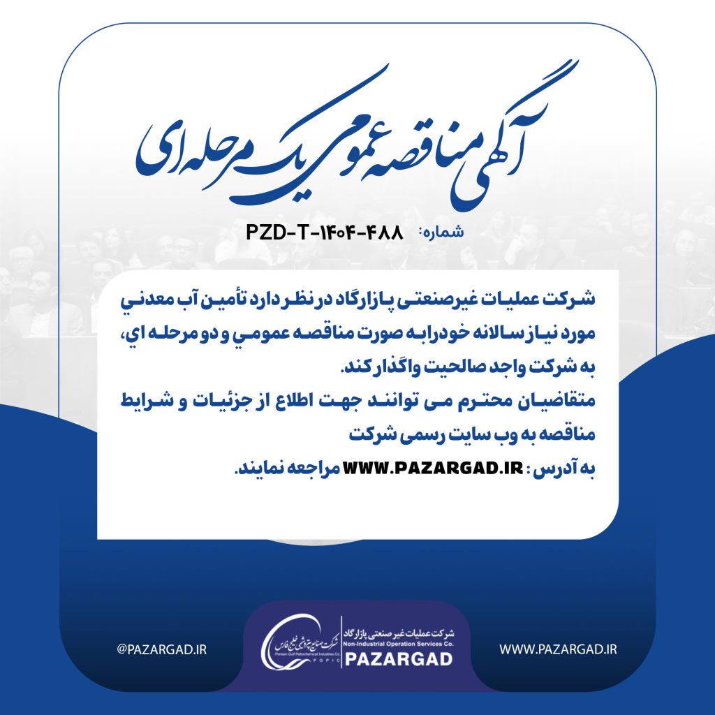 شرکت عملیات غیرصنعتی پازارگاد در نظر دارد تامین آبمعدنی مورد نیاز سالانه خود را به صورت مناقصه عمومی و دو مرحله ای، به شرکت واجد صلاحیت واگذار کند.
