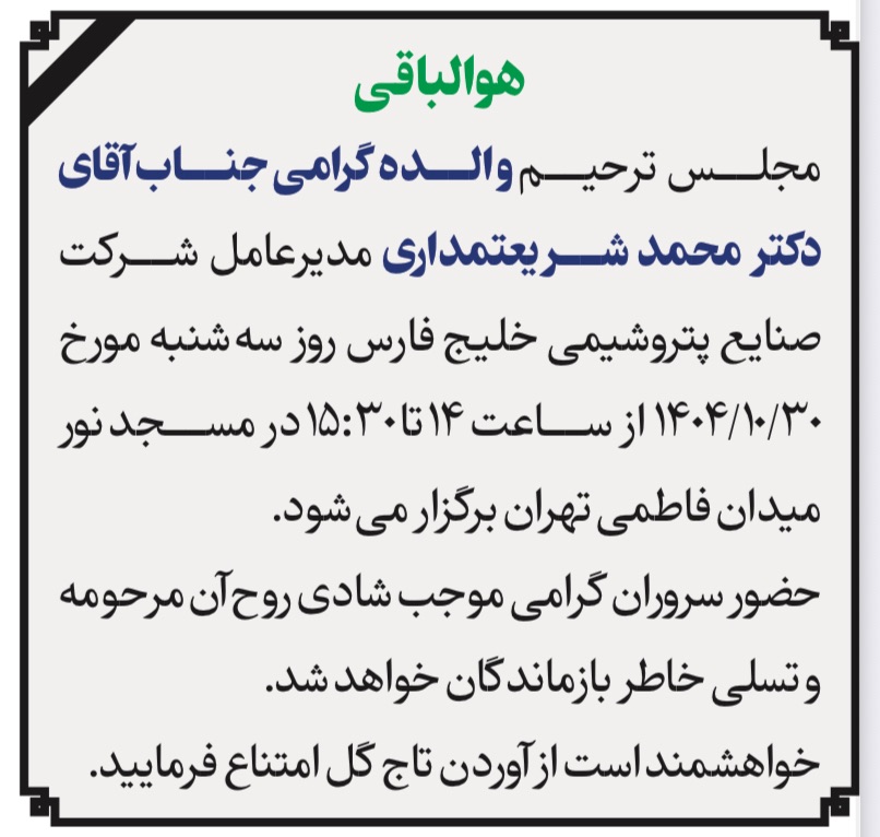 مجلس ترحیم والده گرامی جناب آقای دکتر محمد شریعتمداری مدیرعامل شرکت صنایع پتروشیمی خلیج فارس روز سه شنبه مورخ ۱۴۰۴/۱۰/۳۰ از ساعت ۱۴ الی ۱۵:۳۰ در مسجد نور میدان فاطمی تهران برگزار میشود.
