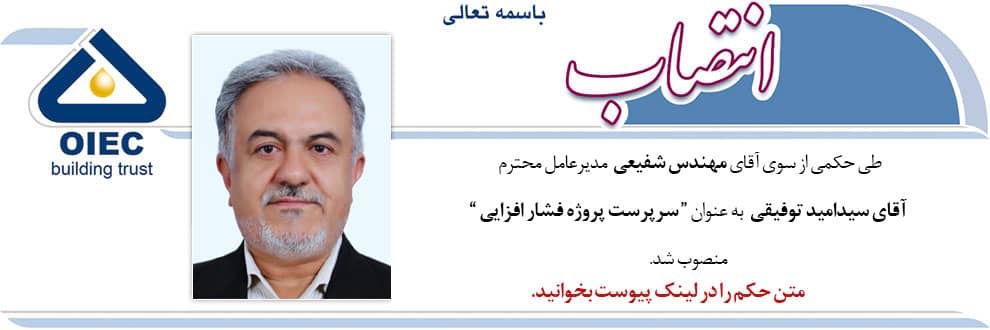 در حکمی از سوی مهندس محمدعلی شفیعی سیفآبادی، مدیرعامل OIEC سید امید توفیقی سرپرست پروژه فشارافزایی در میدان گاز پارس جنوبی شد.