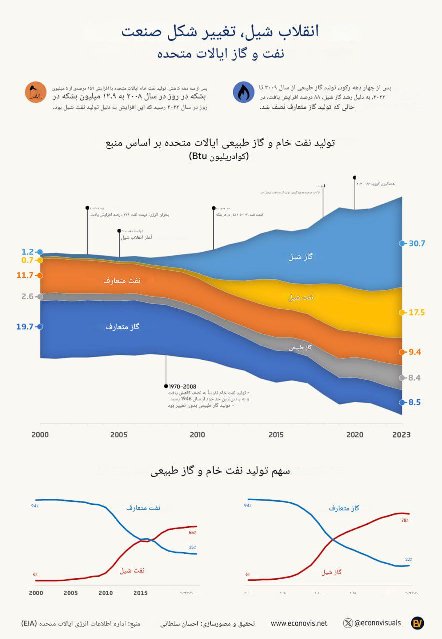 به گزارش پتروشیمی ها، پس از چهار دهه رکود، تولید گاز طبیعی از سال ۲۰۰۹ تا ۲۰۲۳، به دلیل رشد گاز شیل، ۸۸ درصد افزایش یافت، در حالی که تولید گاز متعارف نصف شد.
