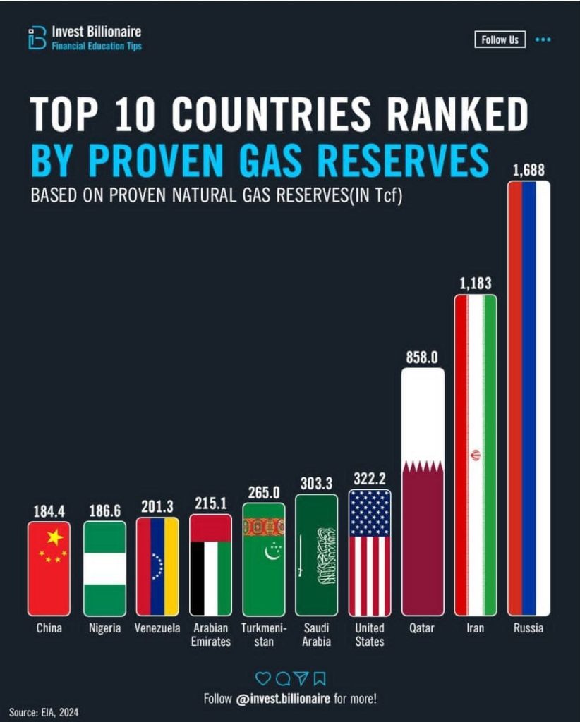 طبق آخرین آمار، سه کشور روسیه (۱۶۸۸ Tcf)، ایران (۱۱۸۳ Tcf) و قطر (۸۵۸ Tcf) عملاً «مثلث طلایی گاز» را تشکیل دادهاند و اختلاف آنها با سایر رقبا نجومی است؛ بهطوریکه ذخایر آمریکا با ۳۲۲ Tcf حتی به یکسوم قطر هم نمیرسد.