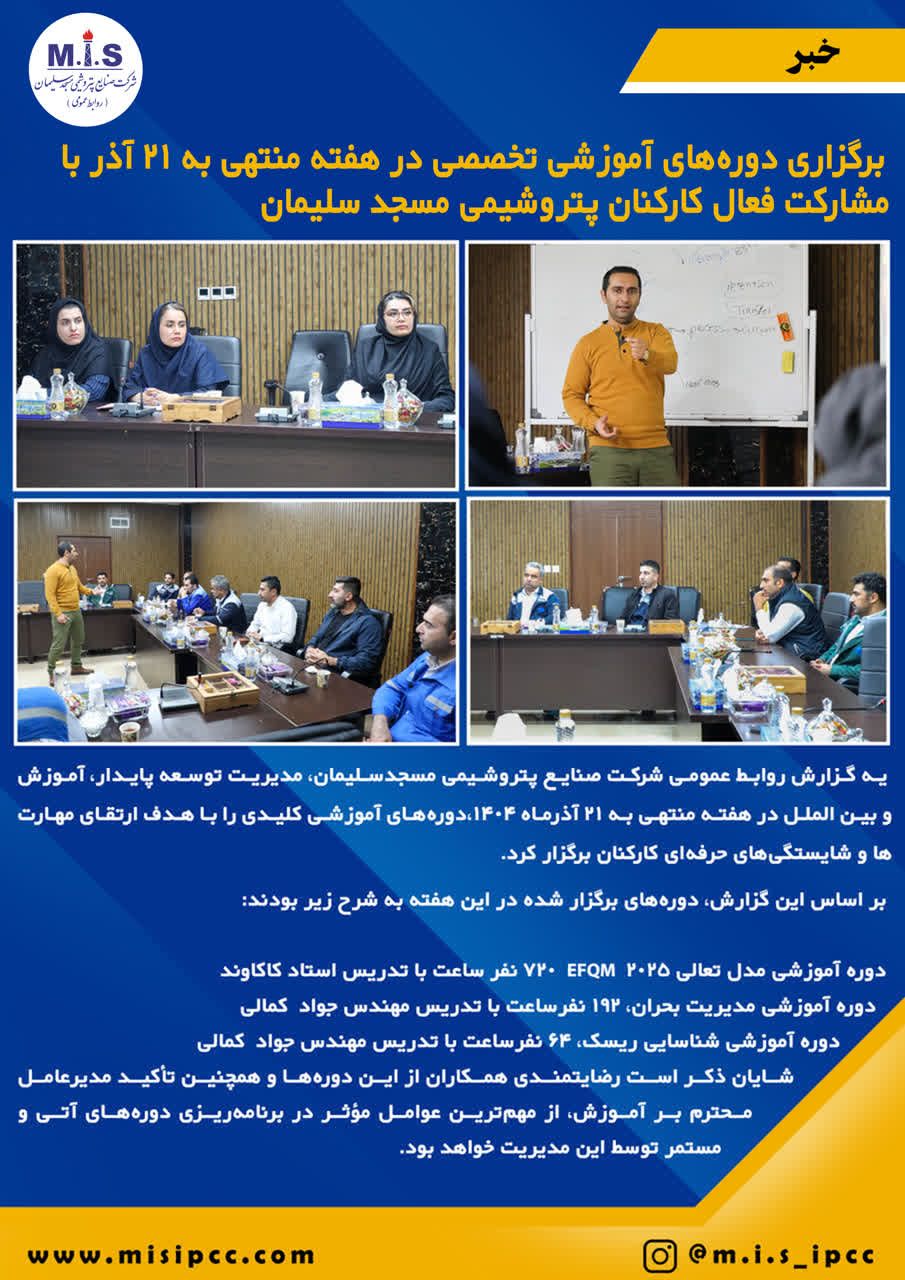 برگزاری دورههای آموزشی تخصصی در هفته منتهی به ۲۱ آذر با مشارکت فعال کارکنان پتروشیمی مسجد سلیمان