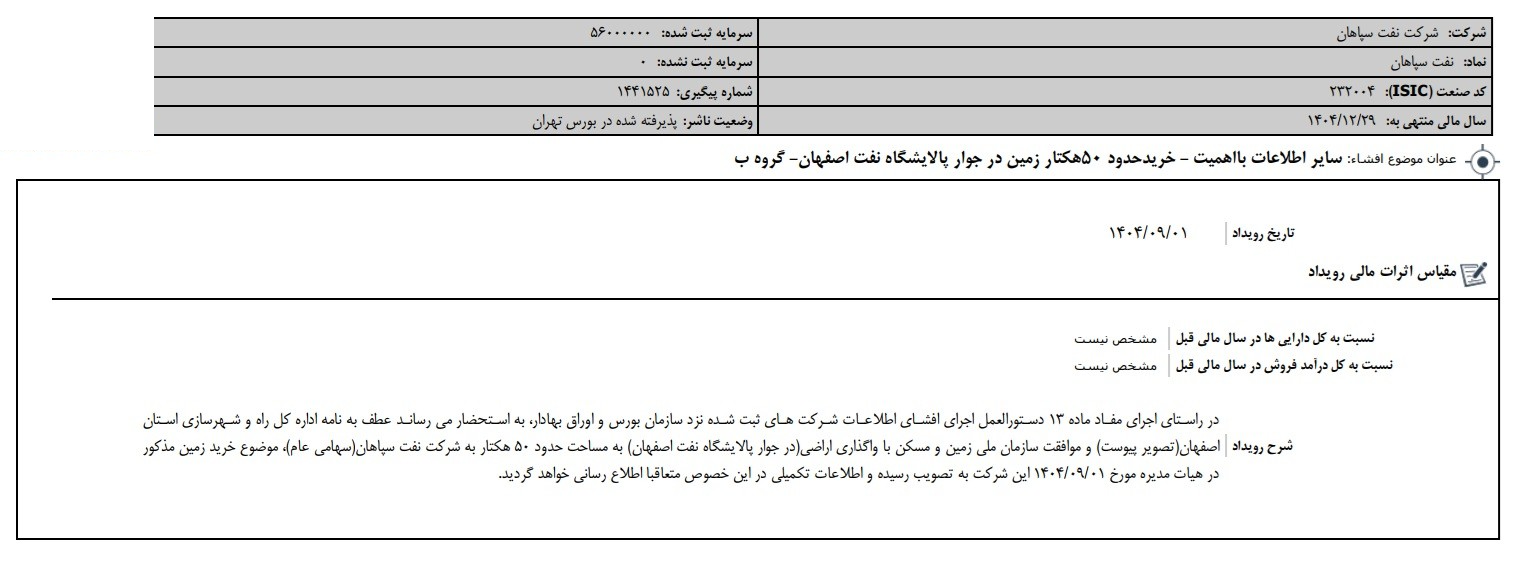 شرکت نفت سپاهان در خصوص خریدحدود ۵۰هکتار زمین در جوار پالایشگاه نفت اصفهان اعلام کرد با توجه به نامه اداره کل راه و شهرسازی استان اصفهان (تصویر پیوست) و موافقت سازمان ملی زمین و مسکن با واگذاری اراضی (در جوار پالایشگاه نفت اصفهان) به مساحت حدود ۵۰ هکتار به شرکت نفت سپاهان (سهامی عام)، موضوع خرید زمین مذکور در هیات مدیره مورخ ۱۴۰۴.۰۹.۰۱ این شرکت به تصویب رسیده و اطلاعات تکمیلی در این خصوص متعاقبا اطلاع‌رسانی خواهد گردید.