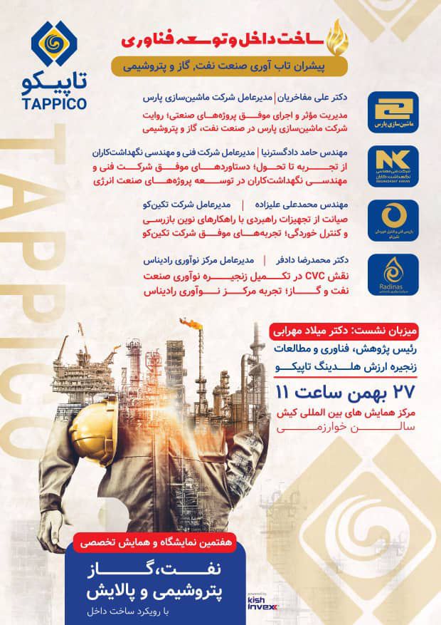 هلدینگ تاپیکو در حاشیه هفتمین نمایشگاه نفت و پتروشیمی کیش، پنل تخصصی «ساخت داخل و توسعه فناوری» را با حضور ۵ چهره دانش‌بنیان برگزار می‌کند.