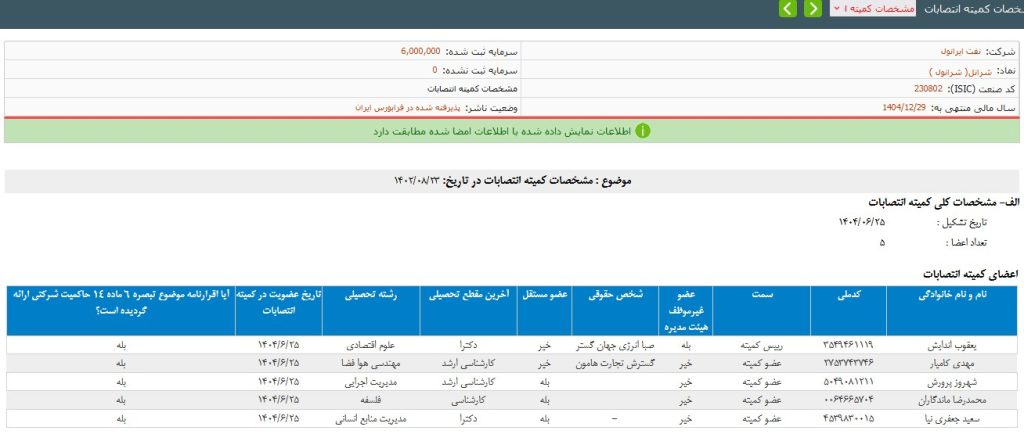 در جدیدترین اطلاعیهی شرکت نفت ایرانول به ترکیب کمیته انتصابات اشاره شده که در آن یعقوب اندایش، از نخبگان اقتصادخوانده بوشهری بعنوان رئیس و آقایان مهدی کامیار، شهروز پرورش، محمدرضا ماندگاران و سعید جعفری نیا بعنوان اعضای این کمیته منصوب شده اند.