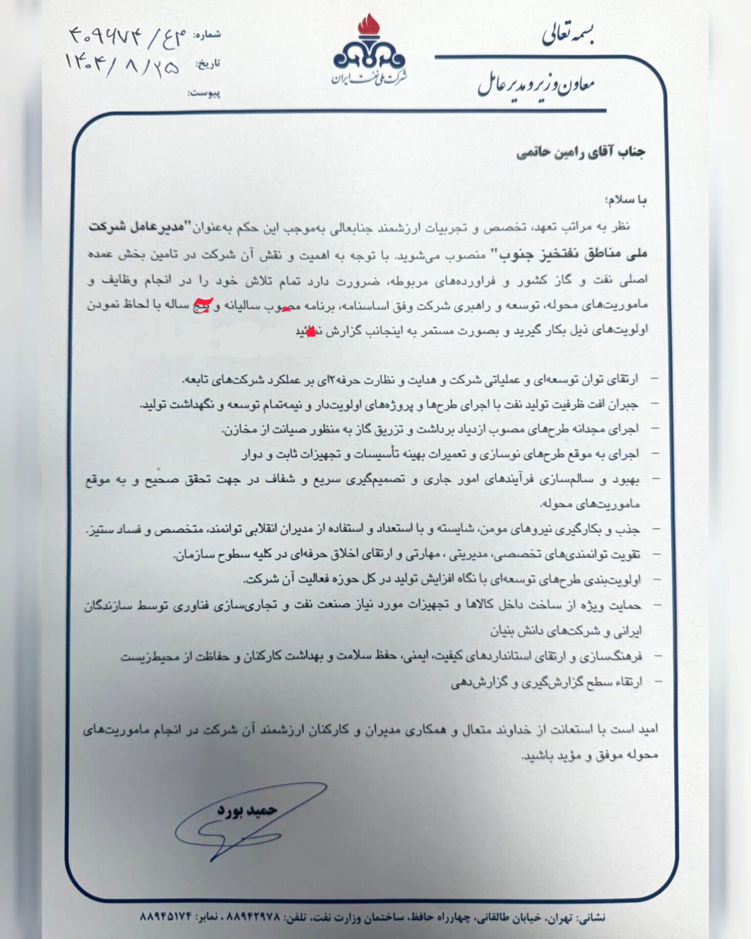 «نظر به مراتب تعهد، تخصص و تجربیات ارزشمند جنابعالی به موجب این حکم بهعنوان مدیرعامل شرکت ملی مناطق نفتخیز جنوب منصوب میشوید. با توجه به اهمیت و نقش آن شرکت در تأمین بخش عمده اصلی نفت و گاز کشور و فرآوردههای مربوطه، ضرورت دارد تمام تلاش خود را در انجام وظایف و مأموریتهای محوله، توسعه و راهبری شرکت وفق اساسنامه، برنامه مصوب سالیانه و پنجساله با لحاظ نمودن اولویتهای ذیل بکار گیرید و بصورت مستمر به اینجانب گزارش نمائید: