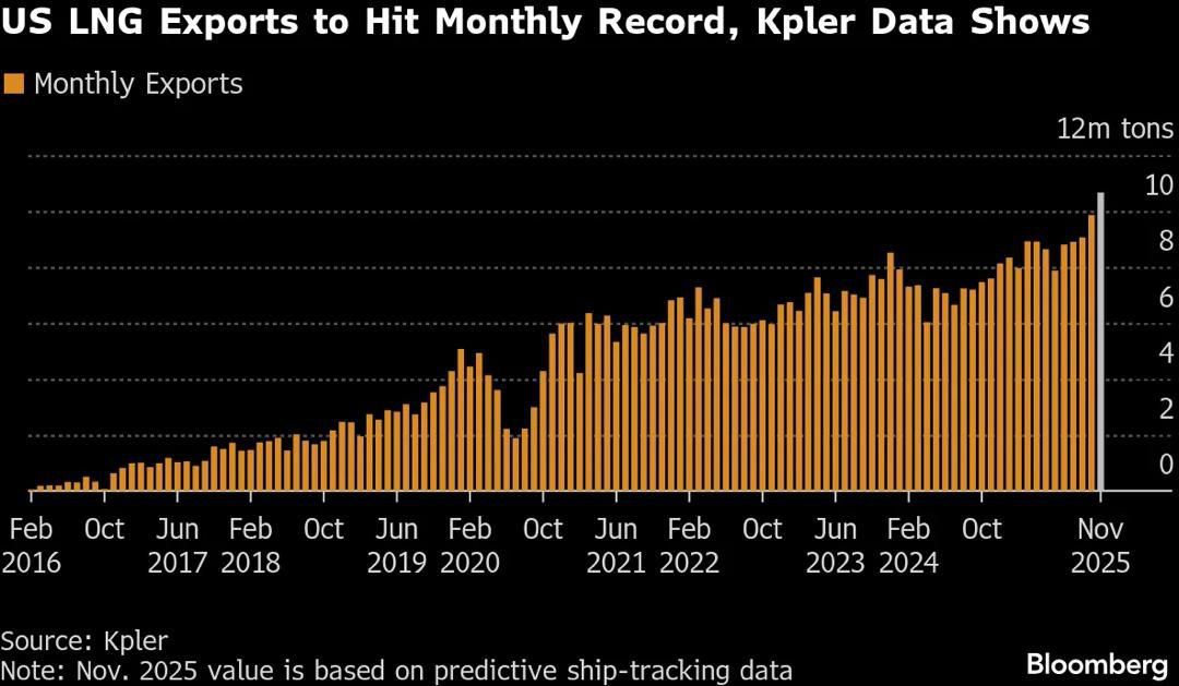 بر اساس نمودار ماهانه بلومبرگ، صادرات گاز طبیعی مایع (LNG) آمریکا از سال ۲۰۱۶ تا پایان ۲۰۲۵ روندی صعودی داشته و در ماه نوامبر ۲۰۲۵ با ثبت رکورد ۱۰.۹ میلیون تن، این کشور به بزرگترین صادرکننده LNG جهان تبدیل شده است.
