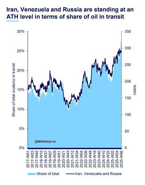 سهم نفت دریابرد سه کشور تحت تحریم (ایران، ونزوئلا و روسیه) در اواخر سال ۲۰۲۵ به ۳۰ درصد رسیده است؛ رقمی که پیش از جنگ اوکراین در سال ۲۰۲۲ حدود ۱۵ درصد بود.