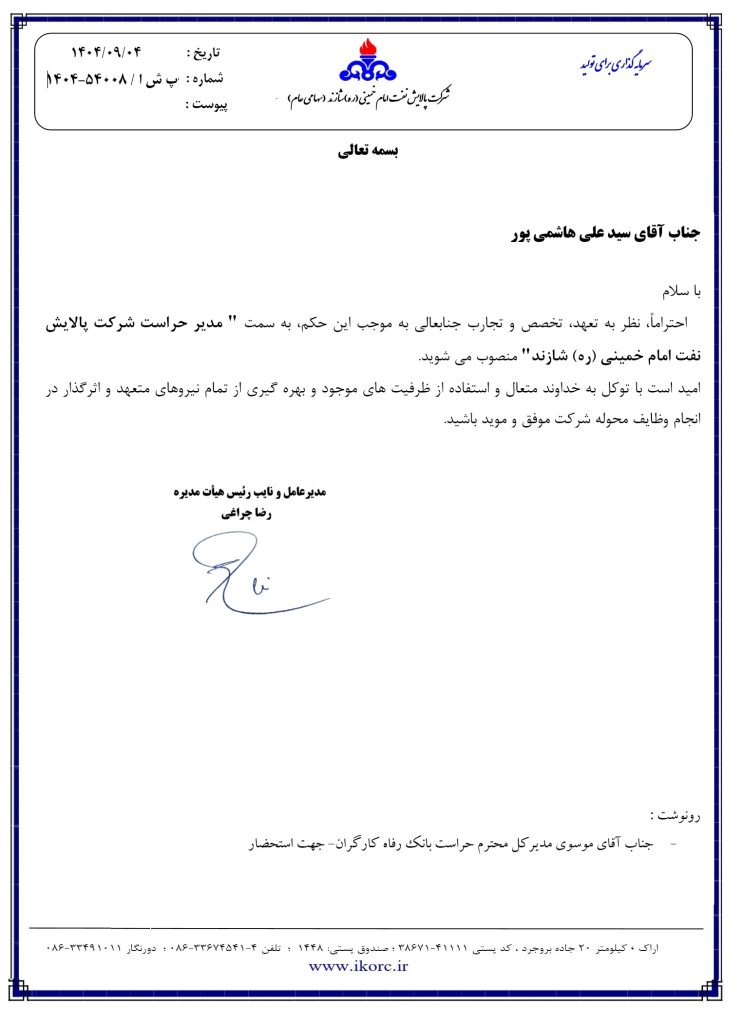 طی حکمی از سوی دکتر رضا چراغی مدیر عامل شرکت پالایش نفت امام خمینی (ره) شازند، آقای سید علی هاشمیپور به عنوان مدیر حراست پالایشگاه منصوب گردید.