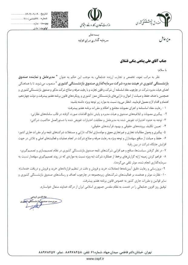 حکم سرپرست صندوق بازنشستگی کشوری به علی پناهی مدیرعامل شرکت سرمایهگذاری صندوق بازنشستگی کشوری به شرح زیر میباشد؛