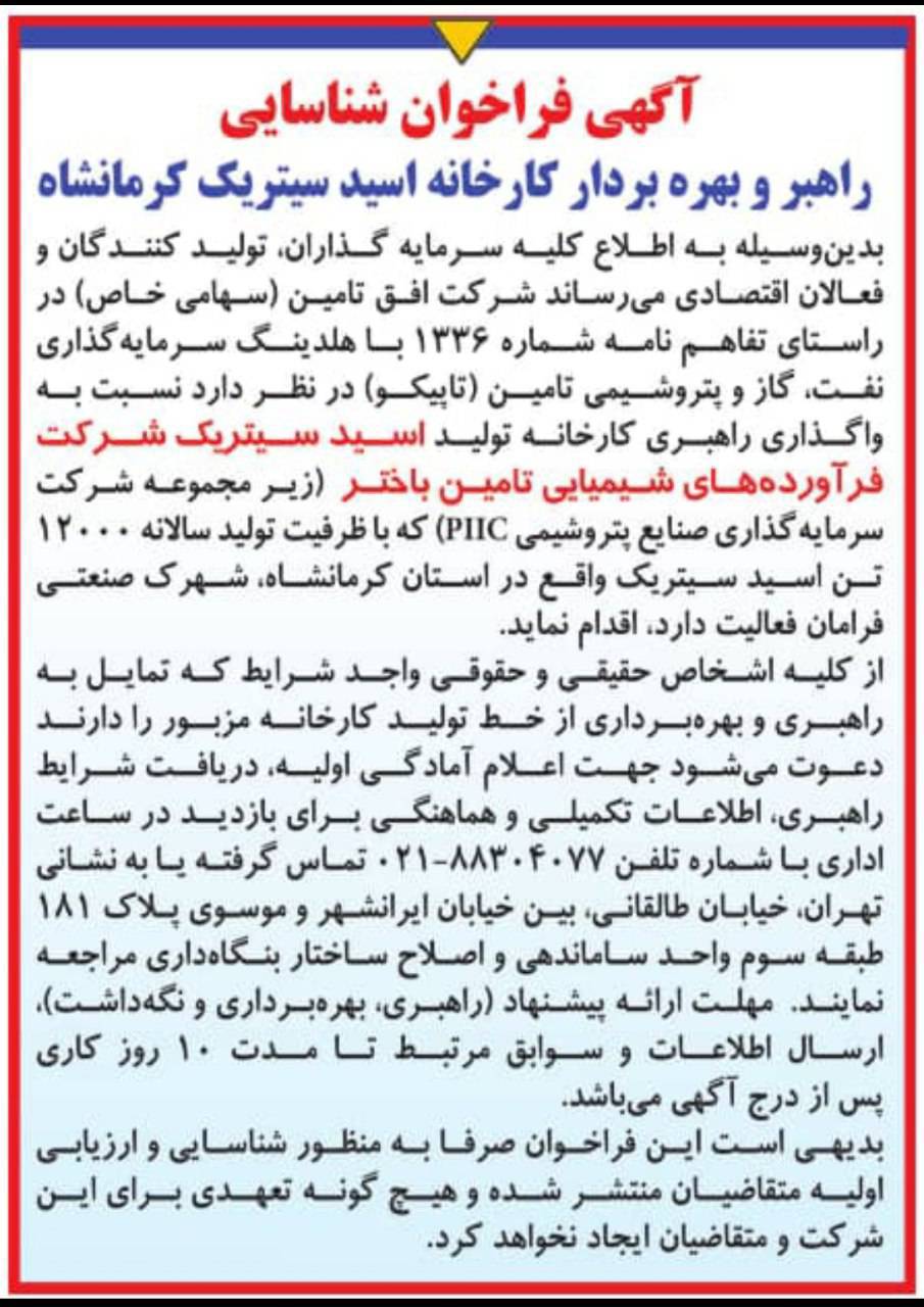 در این فراخوان آمده است: «به اطلاع کلیه سرمایهگذاران و فعالان اقتصادی میرساند شرکت افق تأمین (سهامی خاص) در راستای تفاهمنامه ۱۳۳۶ با هلدینگ سرمایهگذاری نفت، گاز و پتروشیمی تأمین (تاپیکو) در نظر دارد نسبت به واگذاری راهبری کارخانه تولید اسید سیتریک شرکت فرآوردههای شیمیایی تامین باختر (زیرمجموعه شرکت سرمایهگذاری صنایع پتروشیمی PIIC) که با ظرفیت تولید سالیانه ۱۲۰۰۰ تن اسید سیتریک واقع در استان کرمانشاه شهرک صنعتی رامان فعالیت دارد، اقدام نماید.