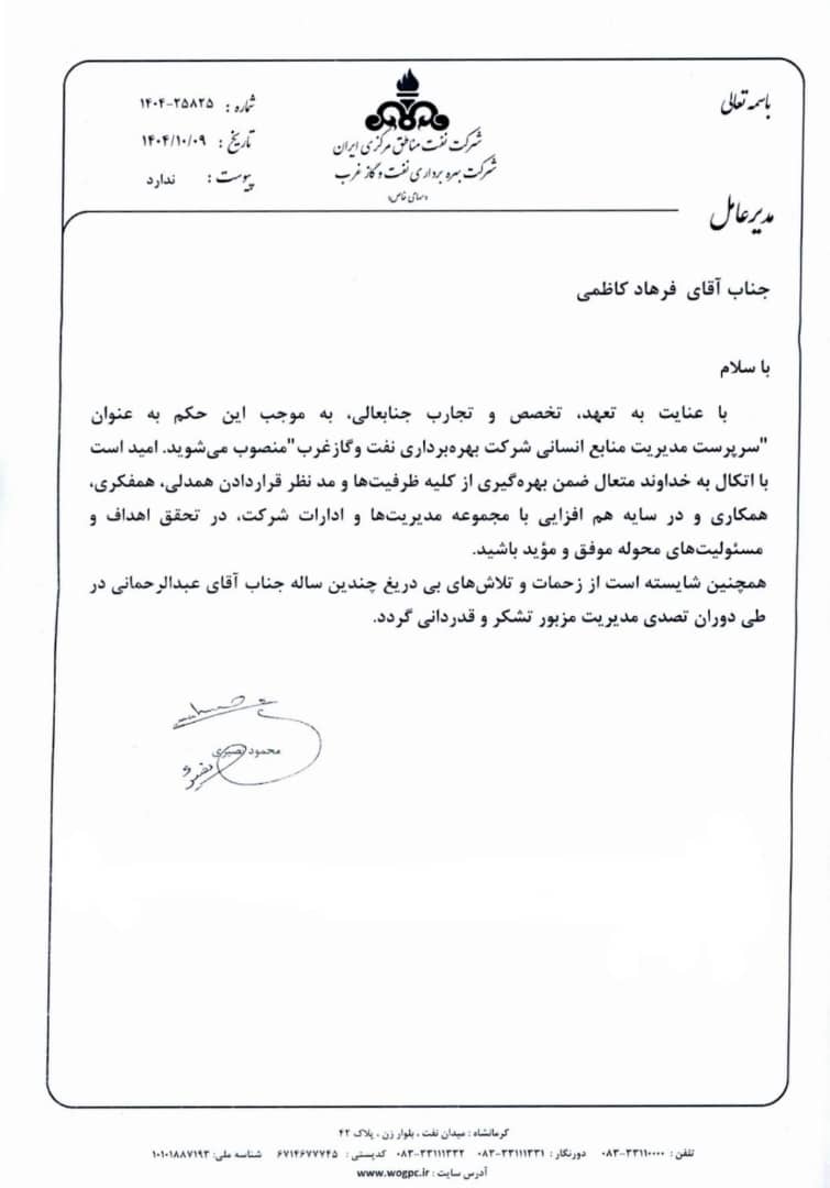 فرهاد کاظمی سرپرست مدیریت منابع انسانی شرکت نفت و گاز غرب شد