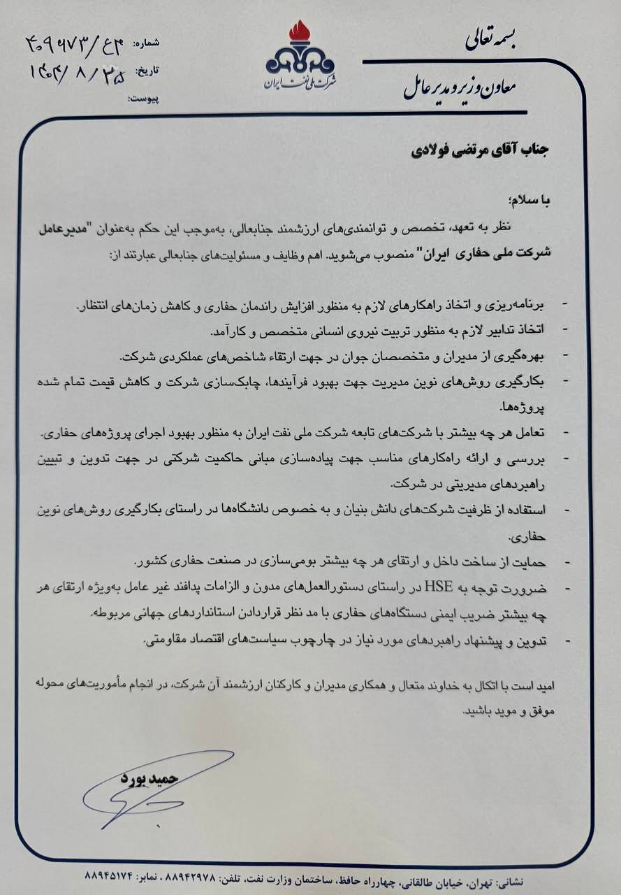 «نظر به تعهد، تخصص و توانمندیهای ارزشمند جنابعالی، به موجب این حکم بهعنوان مدیرعامل شرکت ملی حفاری ایران منصوب میشوید. اهم وظایف و مسئولیتهای جنابعالی عبارتند از: