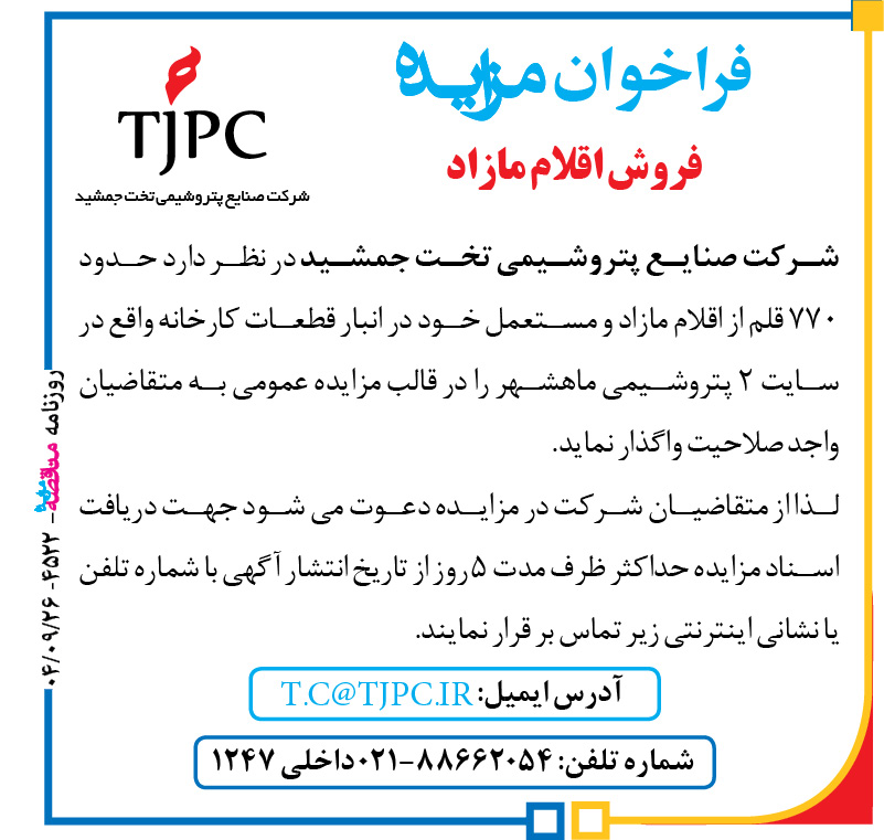 شرکت صنایع پتروشیمی تخت جمشید در نظر دارد حدود ۷۷۰ قلم از اقلام مازاد و مستعمل خود در انبار قطعات کارخانه واقع در سایت ۲ پتروشیمی ماهشهر را در قالب مزایده عمومی به متقاضیان واجد صلاحیت واگذار نماید. لذا از متقاضیان شرکت در مزایده دعوت می‌شود جهت دریافت اسناد مزایده حداکثر ظرف مدت ۵ روز از تاریخ انتشار آگهی با شماره تلفن یا نشانی اینترنتی زیر تماس بر قرار نمایند.