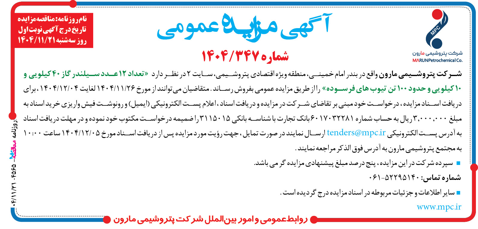 شرکت پتروشیمی مارون واقع در بندر امام خمینی، منطقه ویژه اقتصادی پتروشیمی، سایت ۲ در نظر دارد «تعداد ۱۲ عدد سیلندر گاز ۴۰ کیلویی و ۱۰ کیلویی و حدود ۱۰۰ تن تیوبهای فرسوده» را از طریق مزایده عمومی بفروش رساند. متقاضیان میتوانند از مورخ ۲۶/۱۱/۱۴۰۴ لغایت ۰۴/۱۲/۱۴۰۴، برای دریافت اسناد مزایده، درخواست خود مبنی بر تقاضای شرکت در مزایده و دریافت اسناد، اعلام پست الکترونیکی (ایمیل) و رونوشت فیش واریزی خرید اسناد به مبلغ ۰۰۰٫۰۰۰ ریال به حساب شماره ۶۰۱۷۰۳۲۲۸۱ بانک تجارت با شناسه بانکی ۳۱۱۵۰۱۵ را ضمیمه درخواست مکتوب خود نموده و در مهلت دریافت اسناد به آدرس پست الکترونیکی tenders@mpc.ir ارسال نمایند در صورت تمایل، جهت رؤیت مورد مزایده پس از دریافت اسناد مورخ ۰۵/۱۲/۱۴۰۴ ساعت ۱۰:۰۰ به مجتمع پتروشیمی مارون به آدرس فوق الذکر مراجعه نمایند.