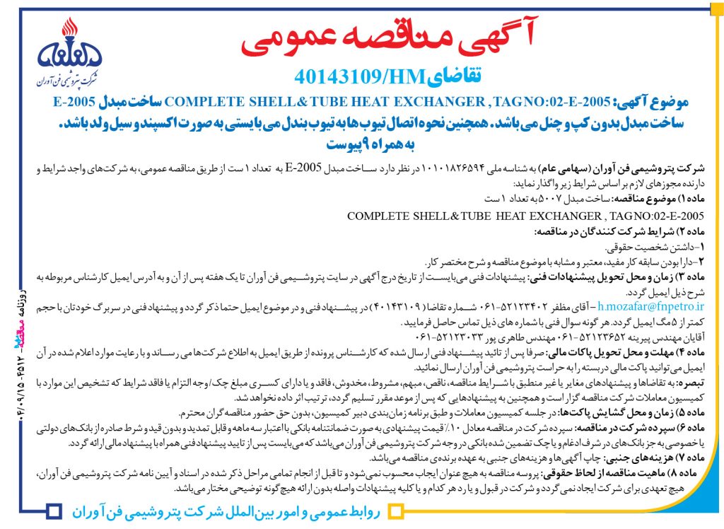 موضوع آگهی: COMPLETE SHELL & TUBE HEAT EXCHANGER، TAG NO: ۰۲ -E- ۲۰۰۵ ساخت مبدل E- ۲۰۰۵ (ساخت مبدل بدون کپ و چنل میباشد. همچنین نحوه اتصال تیوبها به تیوب بندل میبایستی به صورت اکسپند و سیل ولد باشد. به همراه ۹ پیوست)