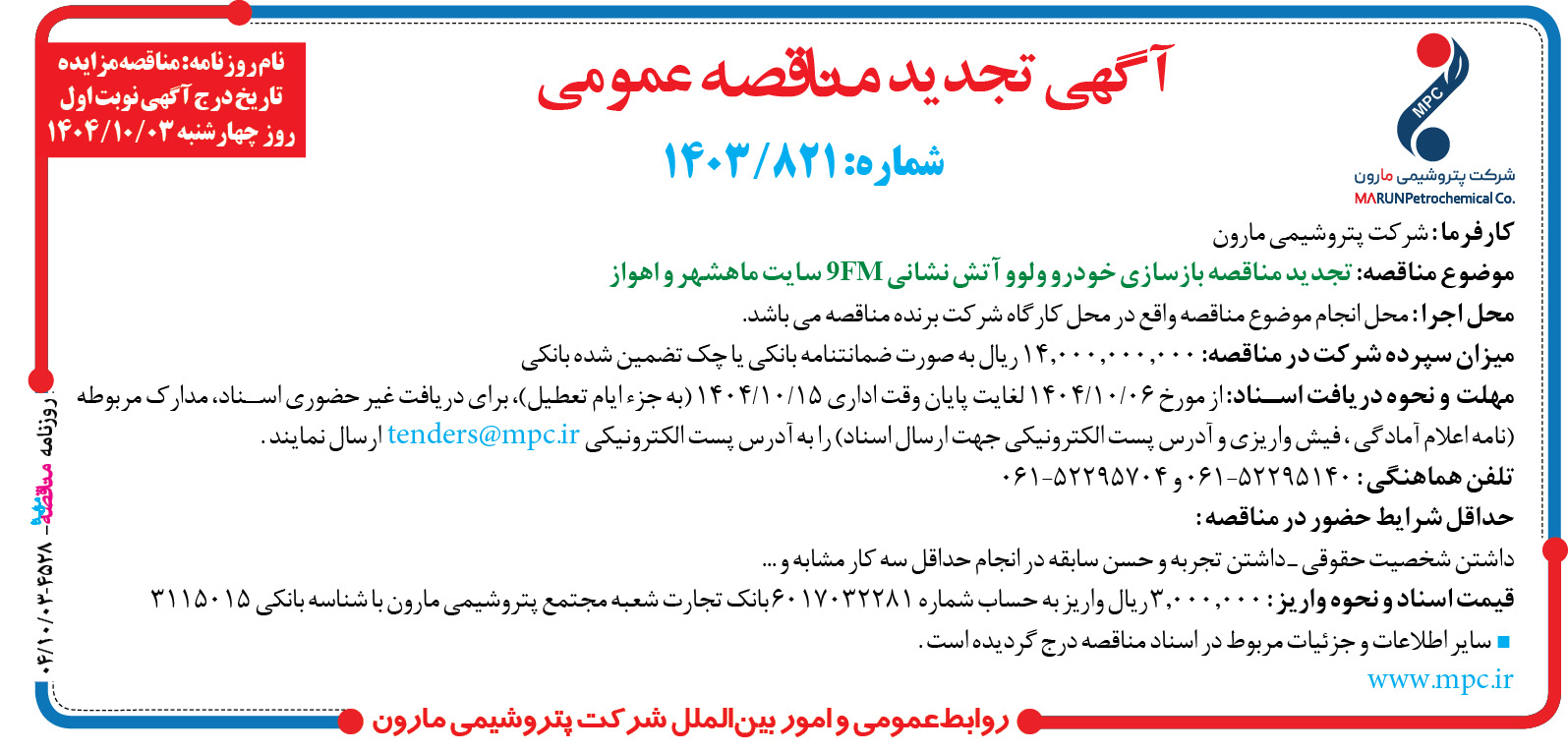 مهلت و نحوه دریافت اسناد: از مورخ ۰۶/۱۰/۱۴۰۴ لغایت پایان وقت اداری ۱۵/۱۰/۱۴۰۴ (به جزء ایام تعطیل)، برای دریافت غیر حضوری اسناد، مدارک مربوطه (نامه اعلام آمادگی، فیش واریزی و آدرس پست الکترونیکی جهت ارسال اسناد) را به آدرس پست الکترونیکی tenders@mpc.ir ارسال نمایند. تلفن هماهنگی: ۵۲۲۹۵۱۴۰-۰۶۱ و ۵۵۹۵۷۰۴-۰۶۱