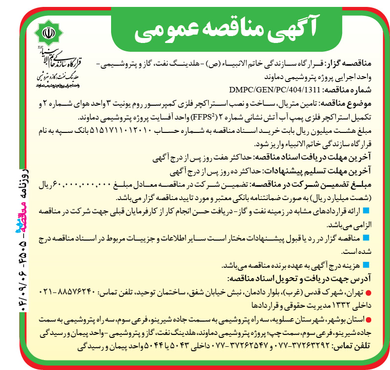 مناقصه گزار: قرارگاه سازندگی خاتم الانبیاء (ص) – هلدینگ نفت، گاز و پتروشیمی – واحد اجرایی پروژه پتروشیمی دماوند