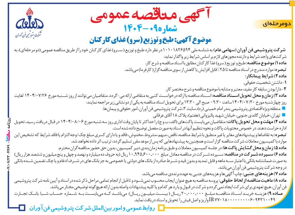 شرکت پتروشیمی فن آوران (سهامی عام) به شناسه ملی ۱۰۱۰۱۸۲۶۵۹۴ در نظر دارد طبخ و توزیع (سرو) غذای کارکنان خود را از طریق مناقصه عمومی (دو مرحلهای)، به شرکتهای واجد شرایط و دارنده مجوزهای لازم بر اساس شرایط زیر واگذار نماید:
