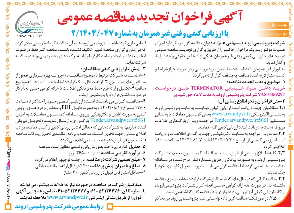 مناقصه ۴۴۷۳ پتروشیمی اروند – خرید داخل مواد شیمیایی TERMINATOR