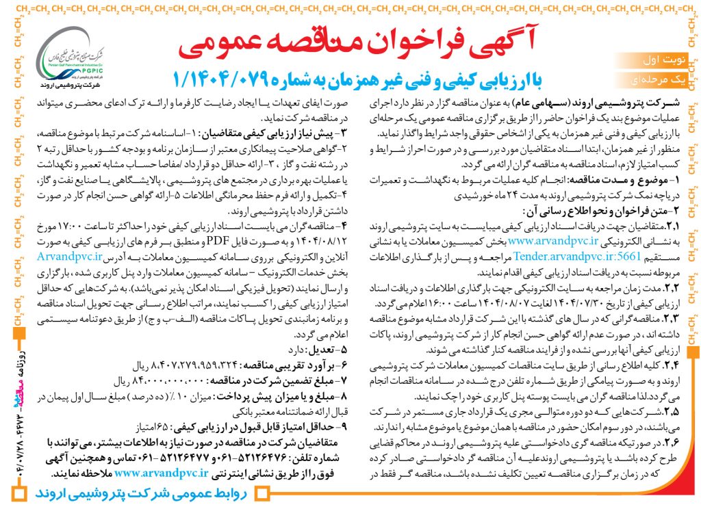 عمومی یک مرحلهای با ارزیابی کیفی و فنی غیر همزمان به شماره ۰۷۹/۱۴۰۴/۱
