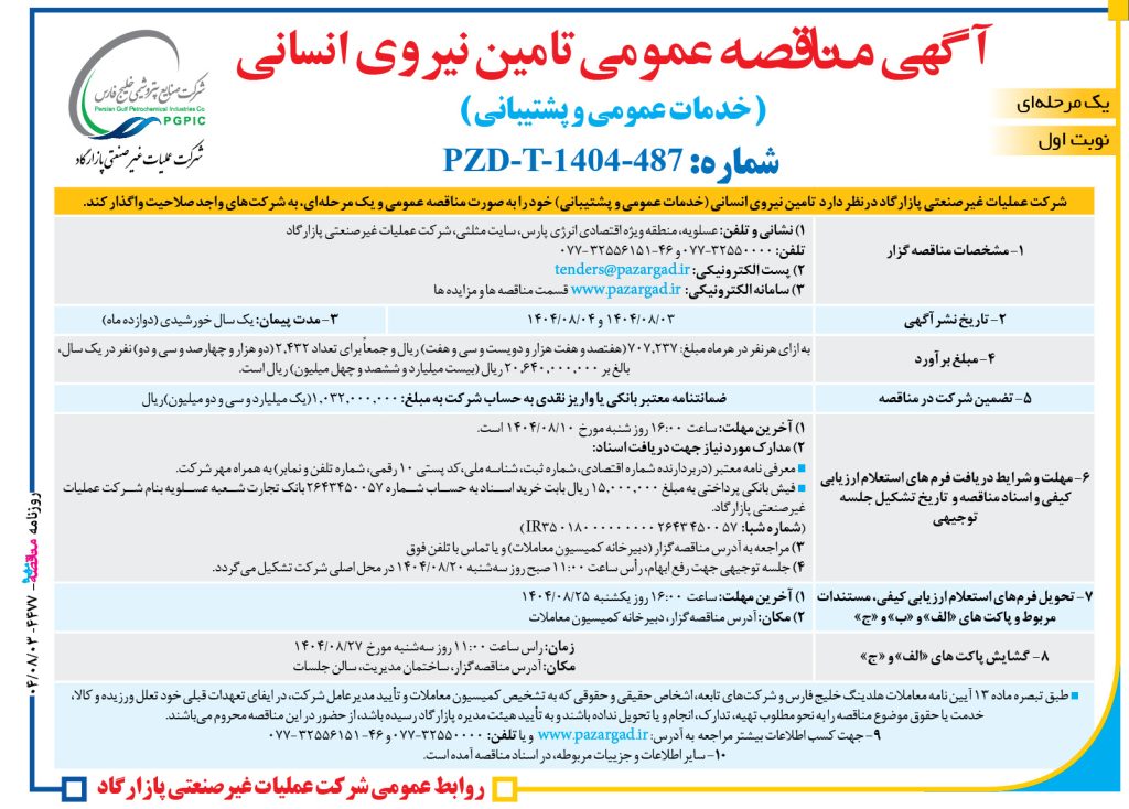 ۴۴۷۷ مناقصه – شرکت عملیات غیرصنعتی پازارگاد – تامین نیروی انسانی