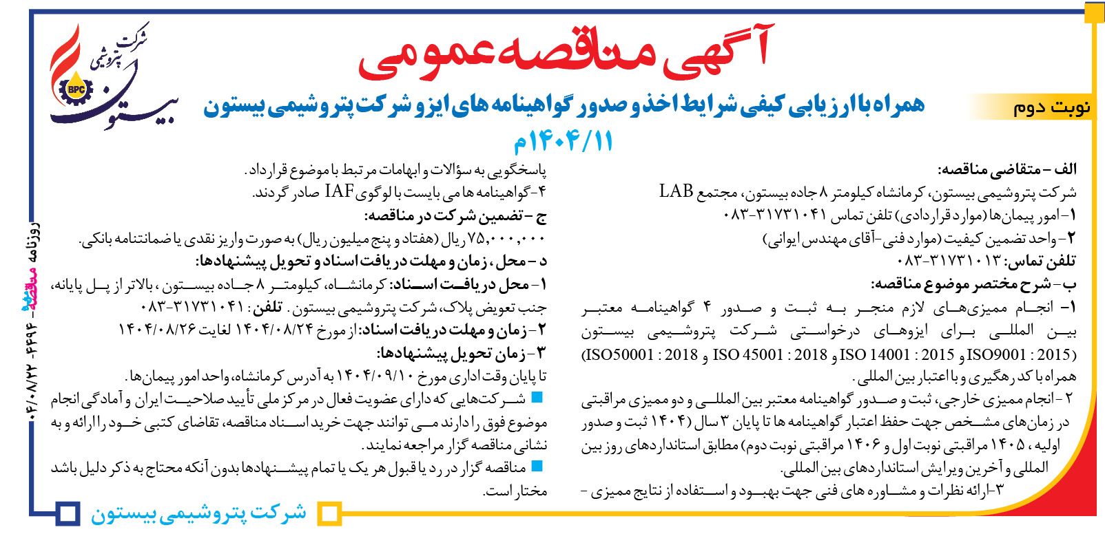 مناقصه ۴۴۹۴ پتروشیمی بیستون – ثبت و صدور ۴ گواهینامه معتبر بین المللی