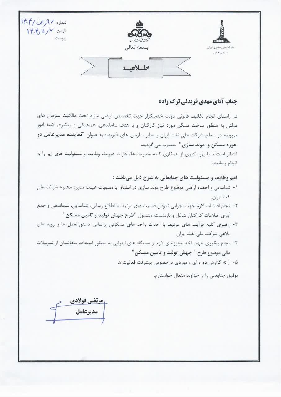 مهدی فریدنی ترک زاده به عنوان نماینده مدیرعامل در حوزه مسکن و مولدسازی شرکت ملی حفاری ایران منصوب شد