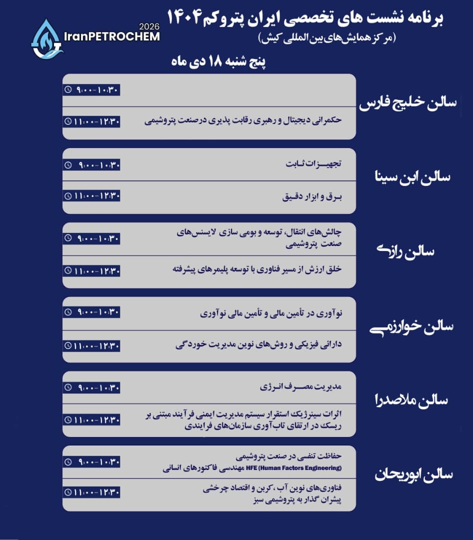 به گزارش پتروشیمی ها؛ نمایشگاه ایران پتروکم ۱۴۰۴ که از روز گذشته در کیش آغاز شده، امروز پنجشنبه ۱۸ دی میزبان نشستهای تخصصی متعددی در سالن همایشهای خلیجفارس خواهد بود. این نشستها در شش سالن مجزا و با حضور مدیران و کارشناسان صنعت پتروشیمی برگزار میشود و موضوعات کلیدی زیر را پوشش میدهد: