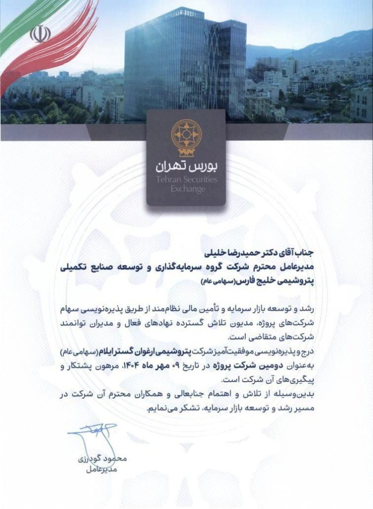 پذیرهنویسی پتروشیمی ارغوان گستر ایلام در بورس تهران روز چهارشنبه مورخ ۱۴۰۴/۰۷/۰۹ با موفقیت انجام شد.