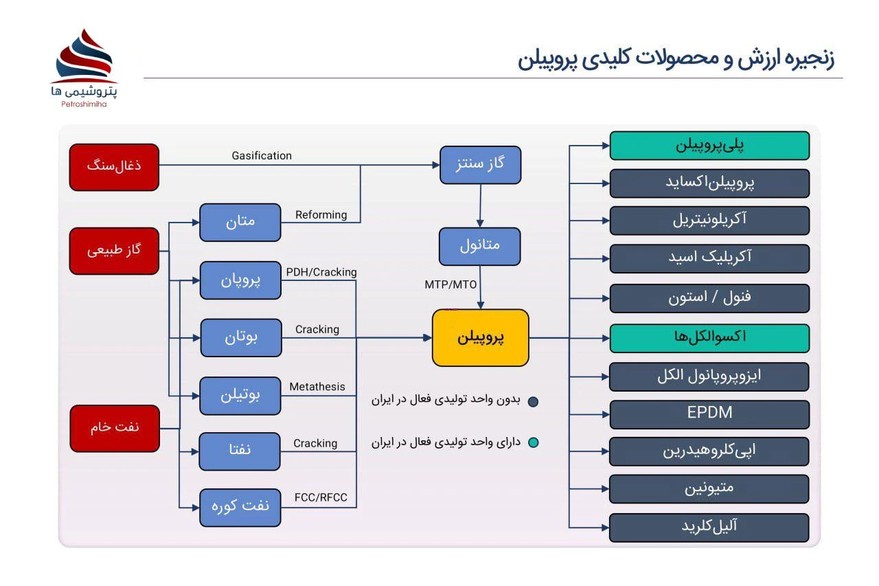 - تمرکز بر تولید پروپیلن و مشتقات ساده آن مانند PPبدون توسعه متوازن صنایع پاییندستی با ارزش افزوده بالاتر