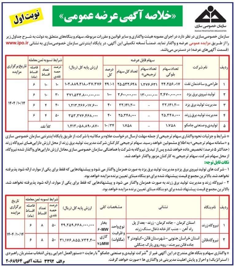 سازمان خصوصی‌سازی در نظر دارد در اجرای مصوبه هیات واگذاری و سایر قوانین و مقررات مربوطه، سهام شرکت‌های «طراحی و ساختمان نفت»، «تولید نیروی برق یزد»، ”مدیریت تولید نیروی برق یزد”، «مدیریت تولید نیروی برق زرند» و” تولیدی و صنعتی جامکوگ و بنگاه‌های «نیروگاه زرندگ و» نیروگاه قائن” را از طریق مزایده عمومی عرضه و واگذار نماید.